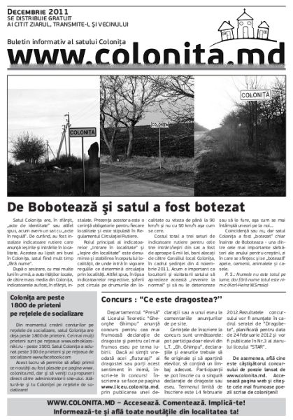 La sfîrșitul săptămînii trecute a fost tipărită și distribuită ediția din luna decembrie 2011 a buletinului informativ al localității www.colonita.md. Ediția din luna curentă a fost tipărită cu suportul Consiliului Sătesc Colonița, în tiraj de 500 exemplare.